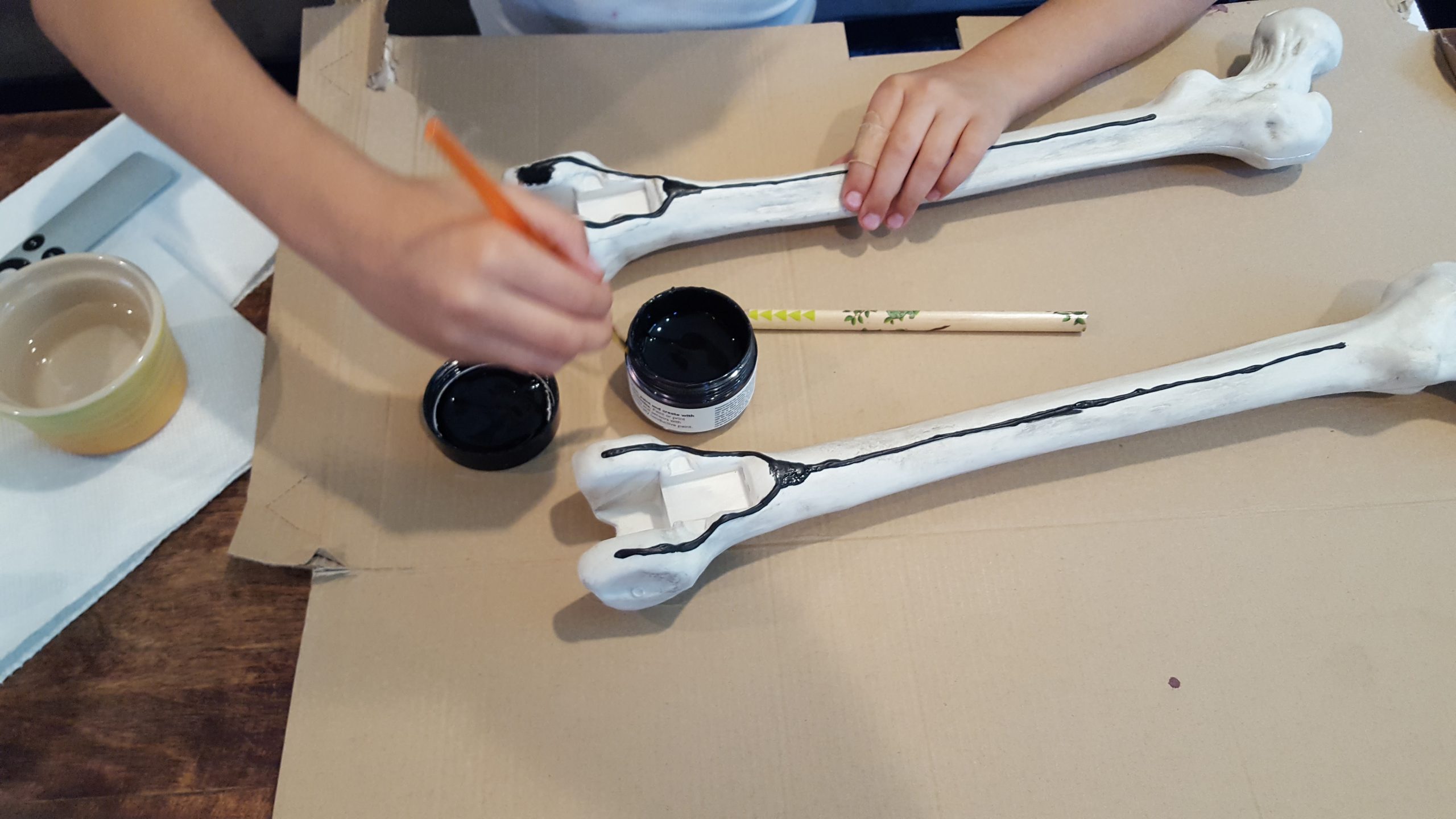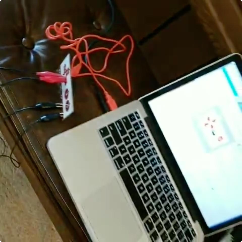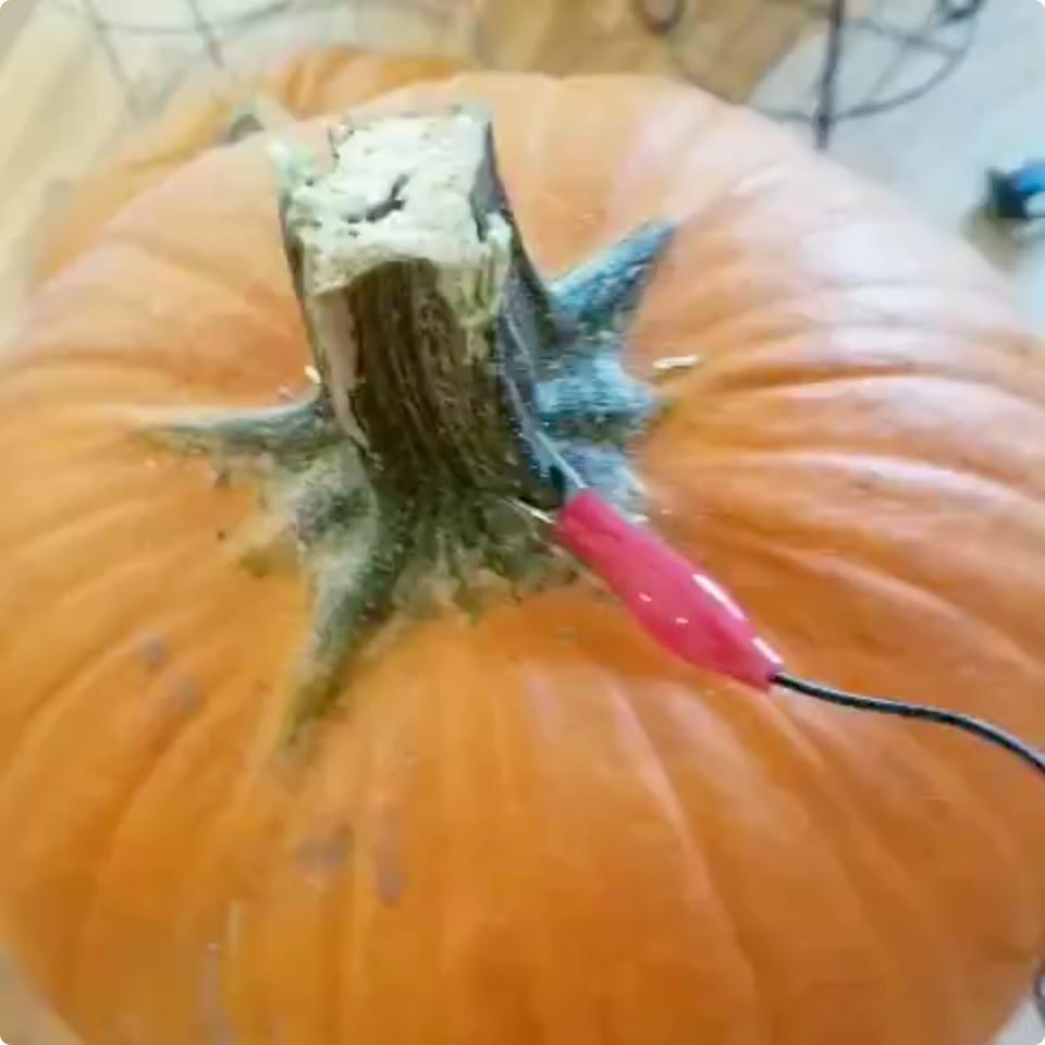 Developed as in interactive experience for Halloween events and neighbor trick or treaters, The Pumpkit is an electronic drumkit made from real pumpkins. Wire leads and conductive paint transmit signals between the Drumstick Bones and a MakeyMakey interface to trigger the sounds on the computer. Each pumpkin is mapped to a specific drum sound to create the experience of a complete drumkit.